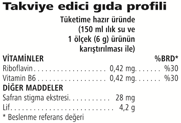 *Tavsiye edilen günlük porsiyonu aşmayın.Takviye edici gıdalar normal beslenmenin yerine geçemez. İlaç değildir ve hastalıkların önlenmesi veya tedavi amacıyla kullanılmaz. Çocukların ulaşamayacağı yerde saklayın.